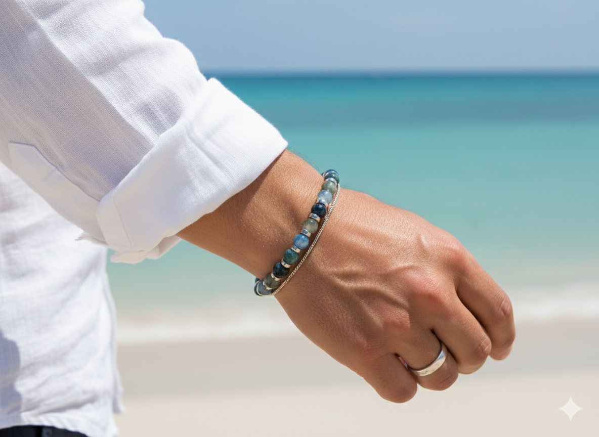 "Como el mar en calma, este brazalete inspira quietud. Creado para ser un fragmento de silencio que llevas en tu muñeca. Su diseño versátil te permite transitar por el día llevando contigo esa sensación de libertad absoluta."